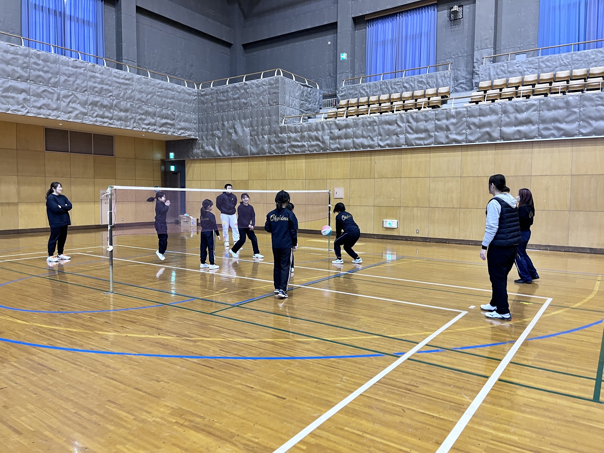 冷え込みの厳しい朝でしたが、集まってくれた参加者の皆さんは、受付をすませると大学生コーチから渡されたソフトバレーボールを手にしました。寒さも感じないほどの元気さでそれぞれ体を動かし始めます。